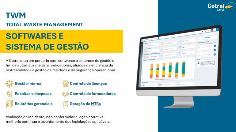 A solução de TWM (Total Waste Management) passou a ser ofertada pela Cetrel após a incorporação ao seu portfólio dos serviços da GRI, maior empresa brasileira e referência no gerenciamento de resíduos industriais, com 25 anos de experiência. Com foco no aumento da sustentabilidade das indústrias e na promoção de uma economia circular e de baixo carbono, o serviço de TWM proporciona a gestão total dos resíduos dentro da própria planta industrial, alcançando altos índices de circularidade, em torno de 90%, por meio de projetos de economia circular, logística reversa e iniciativas de aterro zero, entre outras. Atualmente, a Cetrel conta com mais de 130 operações de TWM e gerencia mais de 500 mil toneladas de resíduos por ano.